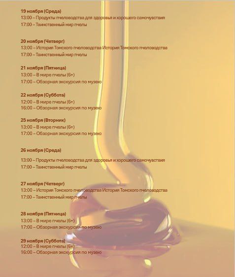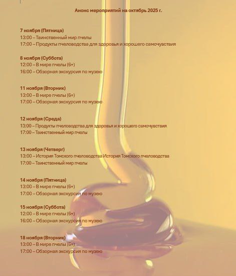 Друзья, мы подготовили для вас насыщенную программу на ноябрь! В нашем музее меда «Пчелотека» вас ждут увлекательные экскурсии, творческие мастер-классы и, конечно, знакомство с удивительным миром пчел.