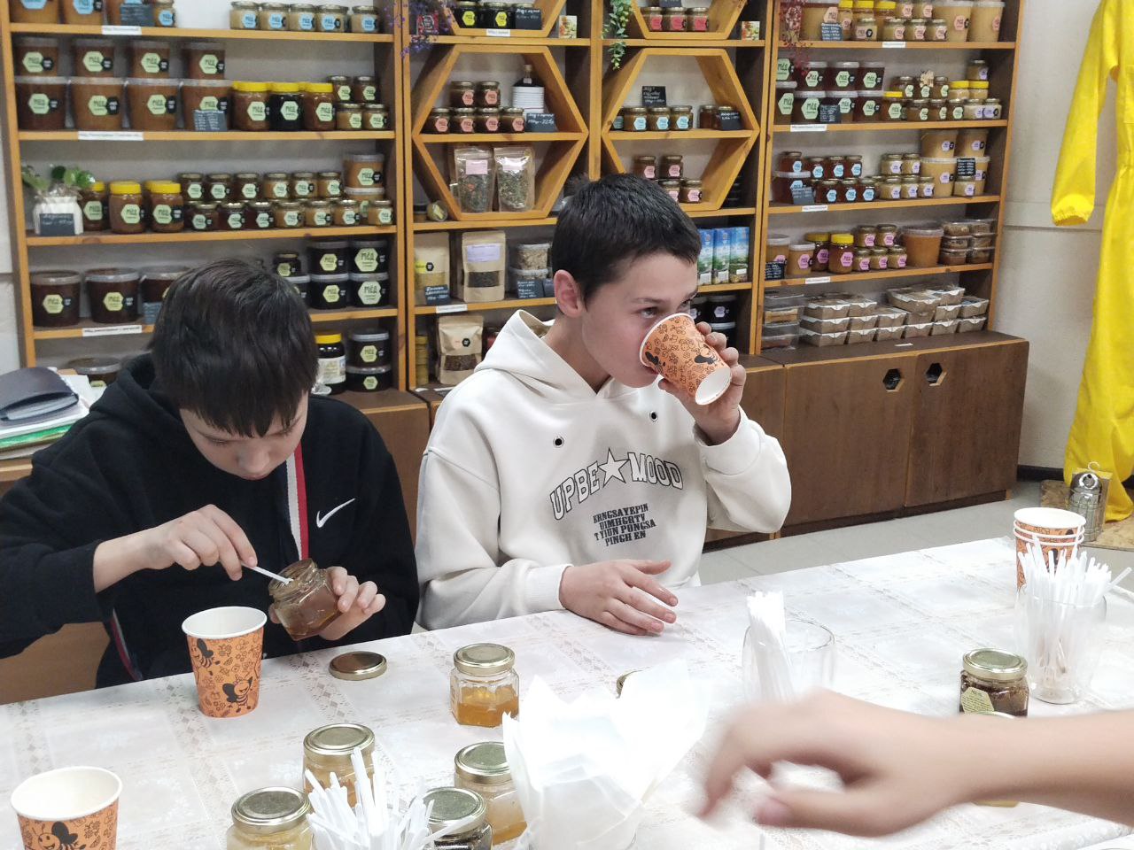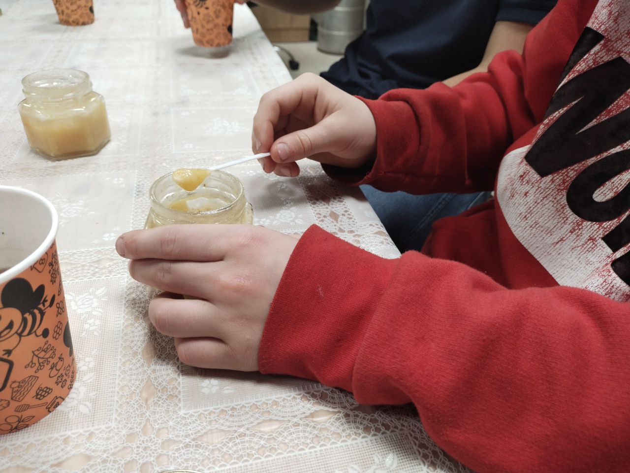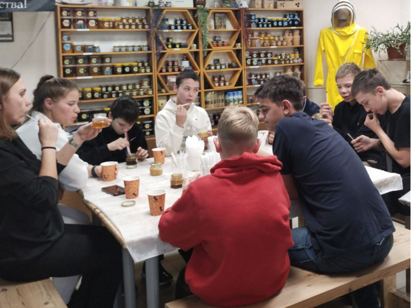 Юные гости с нетерпением ждали медовую дегустацию. Ароматный травяной чай, секретный состав которого они пытались угадать, пришёлся всем по душе. А уж ассортимент медов и вовсе вызвал бурю восторга! Ребята с большим удовольствием пробовали разные сорта мёда, представленные в нашем музее.